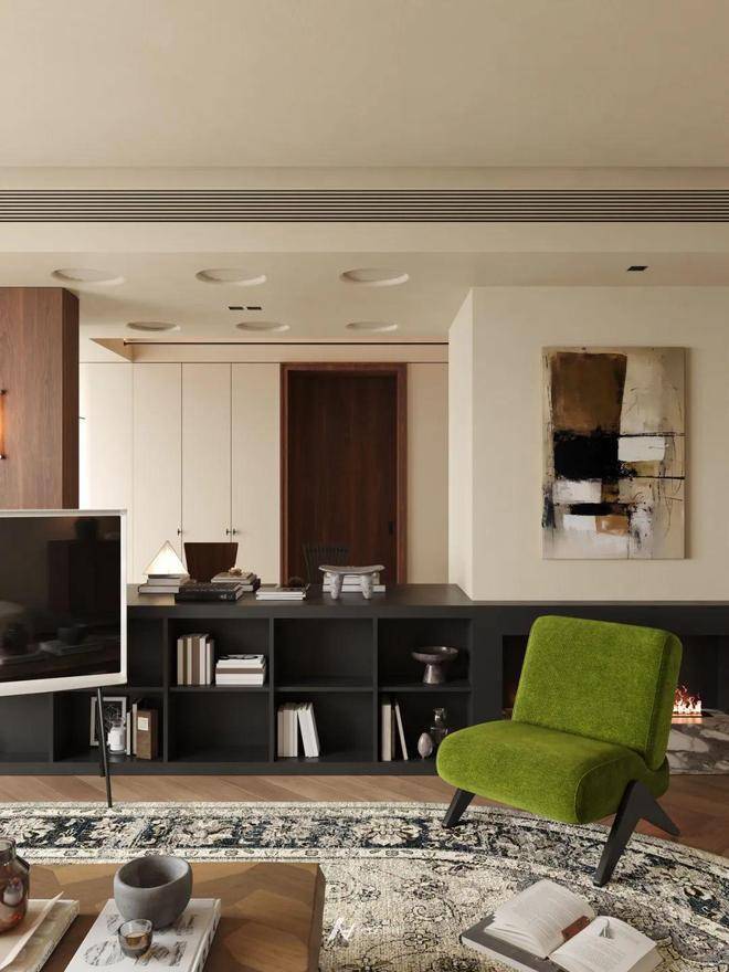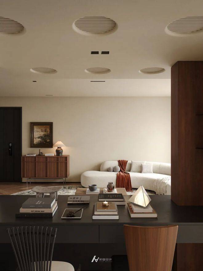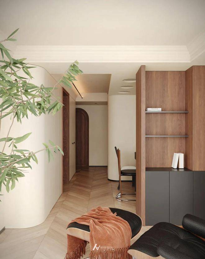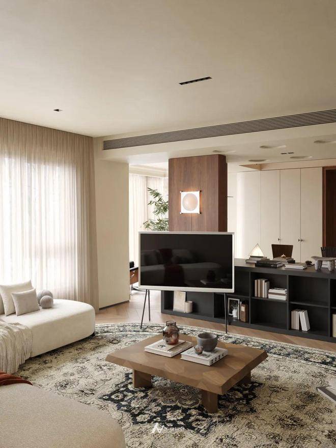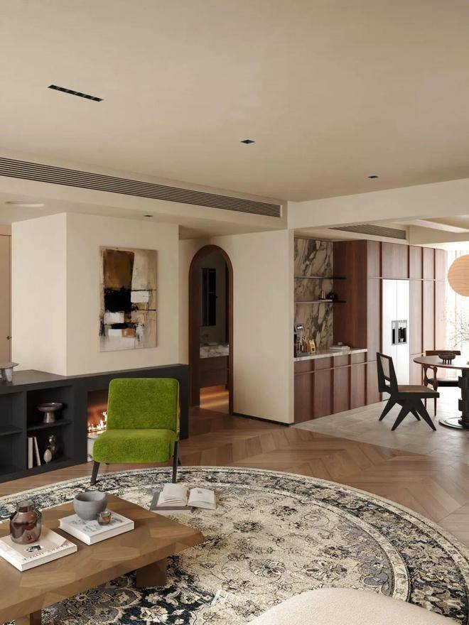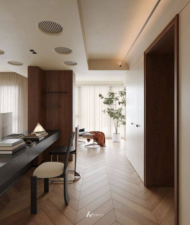 将客厅与复合功能连接一体,以人字形拼花地板串联整体,实现空间自然过渡。一侧打造一体化书桌+收纳柜体,满足办公与置物需求; 另一侧借落地窗引入充足光线,布置休闲躺椅区,营造松弛氛围。 顶面通过线性灯、圆形风口划分区域,既保证空间通透连贯,又以功能区的相对独立,构建出“办公 - 休闲 - 收纳” 有序且融合的生活场景,诠释简约高效的现代空间利用逻辑。