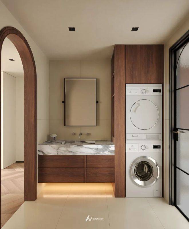 打破客厅、餐厨区物理隔断,以流畅动线串联,消除空间割裂感,让视觉与活动范围双向延伸,小空间显大,大空间更通透。利用地面拼花、顶面暗藏风口的连贯设计,弱化功能区边界,借材质、造型过渡实现“无形扩容”,空间层次更融合。拱门、开放柜体(如大理石餐边柜 )引入相邻空间光线与景致,延伸视觉深度,让客厅借餐厨采光,餐厨借客厅视野,双向放大空间感。客厅收纳、餐厨操作区与社交区结合,减少单一功能对空间的占用,让区域“一专多能”,变相提升空间利用率,达成扩容效果。