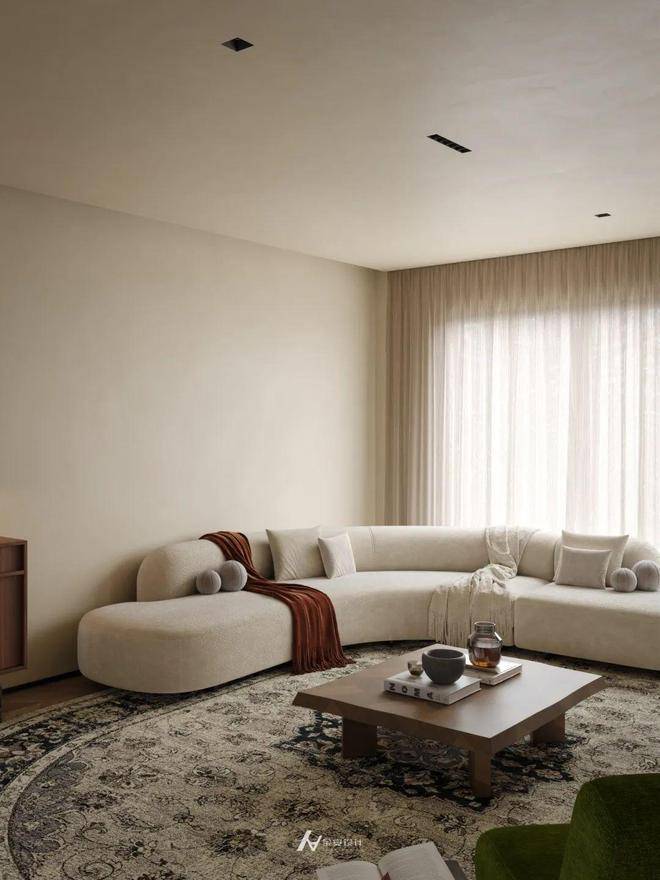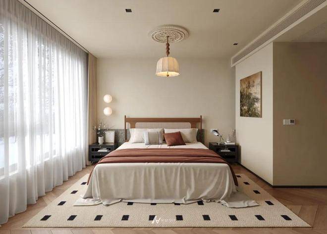 次卧以柔和米调为底色,营造静谧氛围。搭配同色系软包床头,浅棕床搭增添层次感。墙面双幅蓝白挂画点缀,打破单调。单侧悬浮床头柜简约实用,垂吊小灯设计精巧。大面积窗幔引入充足光线,地毯曲线元素柔化空间,整体布局简洁舒适,兼具温馨与雅致,适配休憩、客房等功能 。