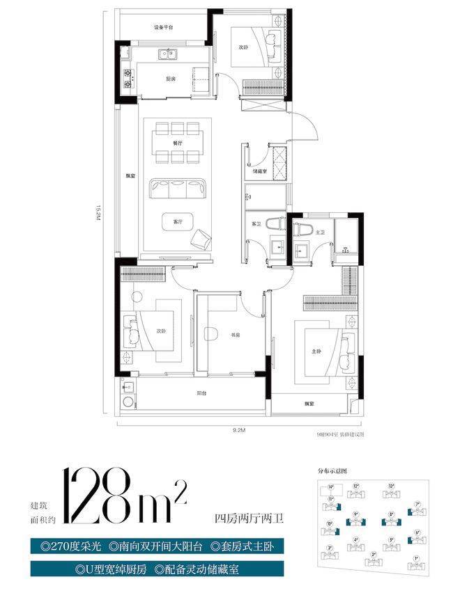 建筑面积约128㎡四房两厅两卫户型,采用“4+1”房设计,满足二胎家庭或三代同堂的居住需求,更比同类面积多了一个储藏空间。三房朝南,餐客厅尺度完全媲美140方以上户型,并且还有一个储藏间,非常贴近二孩家庭或者三代同堂家庭的需求。