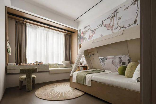 LDKB一体式打造,联动餐厨空间和休闲区,配上超大景观阳台,将室外景色引入户内,打破空间边界,引飞叶与花香穿堂留痕。阳台作为现代人向往自然的精神角落,以秘境庄园为主题进行空间设计,居家步履的尽头,邂逅勃勃生机。周末的午后,阳光打在摇椅上,品一盏清茗,暖意在花间鸟语中绽放。