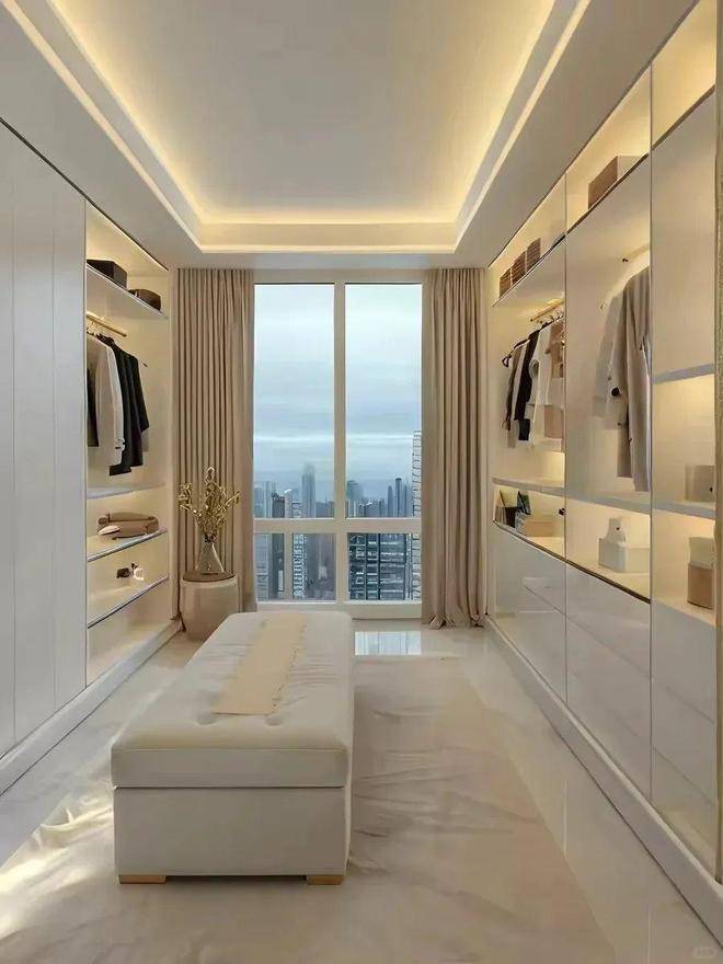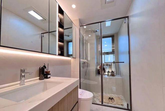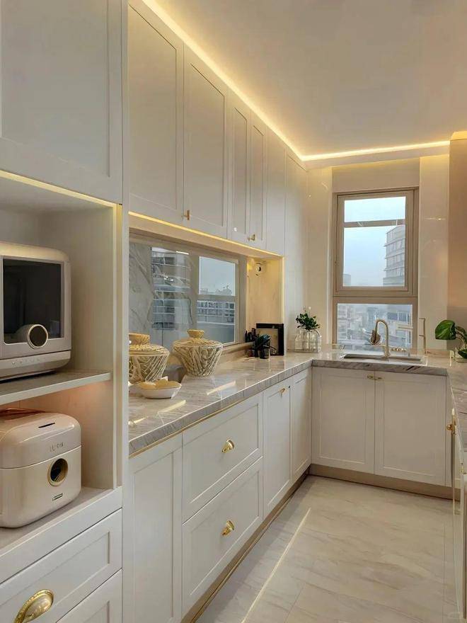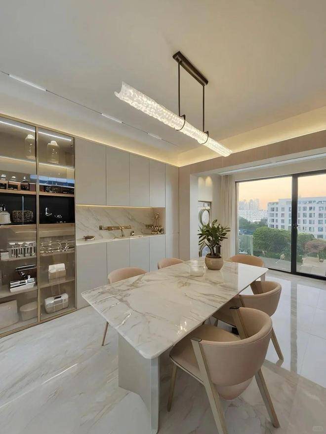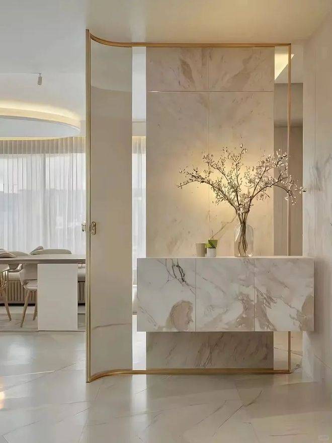 装修风格选的是现代轻奢风,整体以奶油白为底色,搭配浅香槟色和原木棕,高级感满满又带着温柔劲儿,一点都不冰冷。地面用了大理石,再加上金属格栅和丝质窗帘,阳光照进来的时候,光泽感绝了,轻奢那味儿一下子就拿捏得死死的。