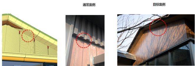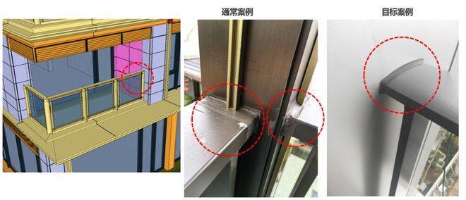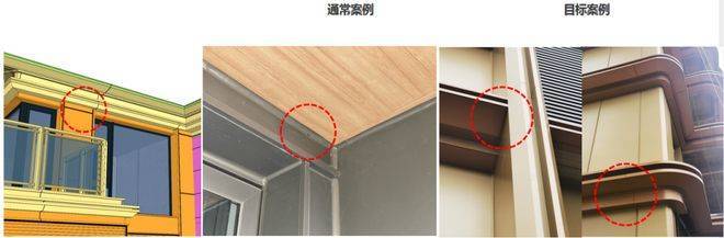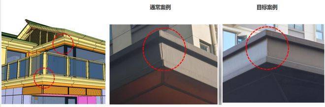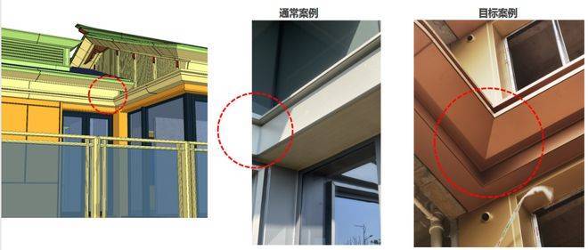 阳台挑檐兼顾防雨和美观的需求,幕墙设计要求金属挑檐顶部朝天缝采用二次打胶工艺,提升挑檐防水性能,减少渗水隐患;吊顶部分为视觉效果的关注点,采用封闭式密拼工艺,再隐藏胶缝的同时达到效果和成本的平衡。