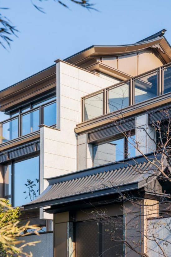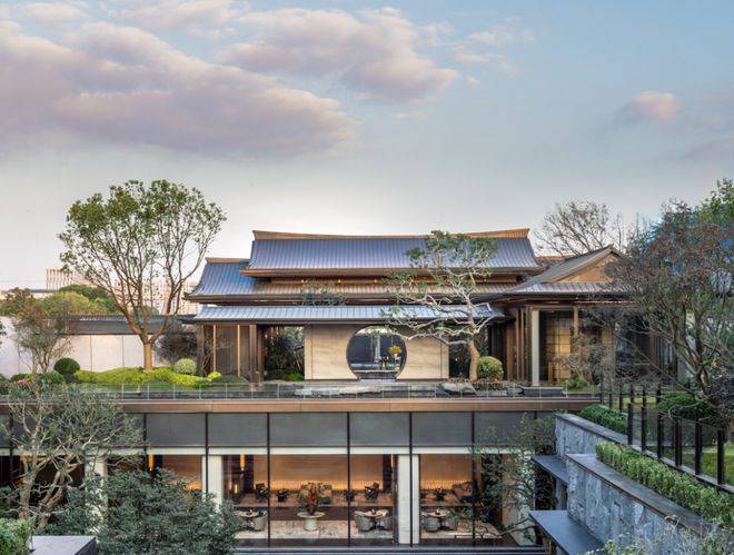 项目建筑取形于传统的宫殿高台,底部采用石材干挂,上部搭配香槟金铝板,既有中式建筑的传统形制,又兼具现代建筑的轻盈感。园林设计以中央水景为原点,配以亭台、连廊、步道和吧台,营造出独特的潮涌氛围。同时,通过局部的格栅漏窗,在若隐若现中,营造出含蓄、幽深的游园之境。