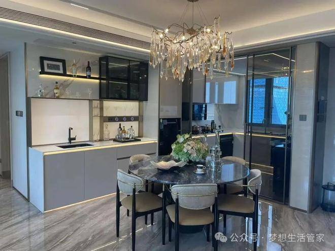 像样板房一样做法,西厨和餐桌的关系紧密,平时家里吃个简餐很便捷,关键这个西厨柜可以做60cm宽度,能内嵌电器和提供大台面。