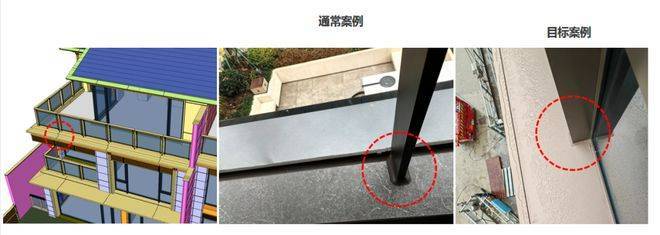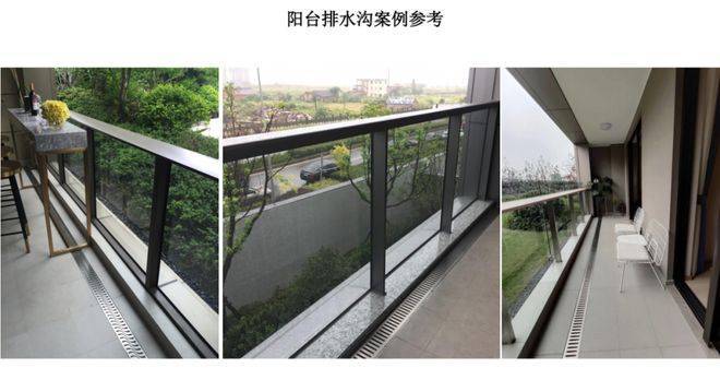 阳台作为室内外交互的重要场所,需要有较好的防水性能、耐久性、美观性,随着高端住宅的客户需求和品质要求,阳台下水从原来简单的地漏升级为线性截水沟,需要再进行建筑扩初设计的时候做好提前预留,另外微踢脚线或无踢脚线设计也能提升项目的品质,踢脚线材质建议采用硬度较高,耐久性较好的石材或者仿石瓷砖;层间造型需要兼顾品质细节和功能需求,局部增加铝合金型材扣盖增加品质感和滴水功能;格栅造型建议适当减小尺寸和疏密度达到效果和成本的平衡。