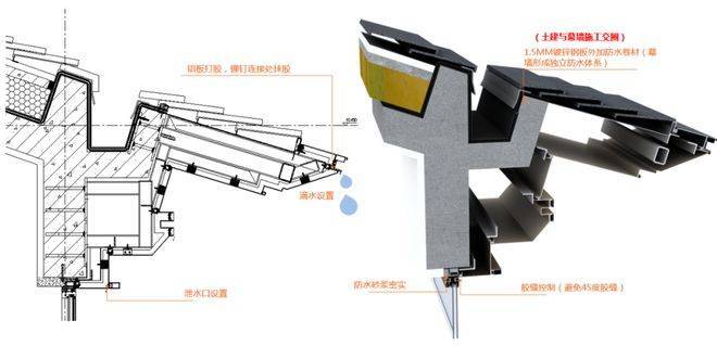 檐口前端采用整体铝合金型材设计提升金属造型的挺拔度和品质感,并且设置滴水防挂污,退阶金属造型适当设置铝合金型材扣盖,提升线条挺拔度并且起到隐藏竖向胶缝的效果。