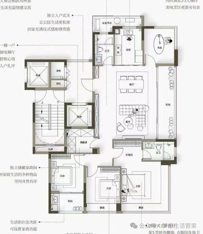 集合这些特色,这个户型比较适合稳定三代同堂居住,保障各自空间,注重家庭亲情氛围,需要各个功能空间合理且又不浪费,生活观念注重实用性。