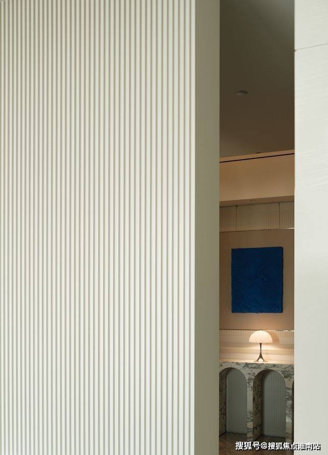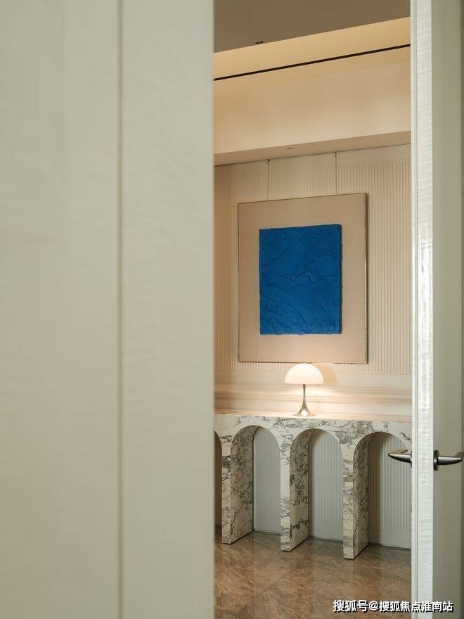 上海静安翡丽铂悦售楼处电话➡:400-8818-994(售楼中心电话)静安翡丽铂悦官方电话➡:400-8818-994(预约看房电话)静安翡丽铂悦售楼处电话➡:400-8818-994(售楼处地址)玄关处的大花白大理石端景台完美融入场景,半圆弧线条与美式竖条纹墙面和谐共生。由设计师和业主夫妻三人共同创作的装饰画,灵感来源英国抽象艺术家杰森·马丁的画作,厚重而又细腻的纹理为空间注入艺术灵魂,克莱因蓝的点缀为整个空间增添一抹亮色。