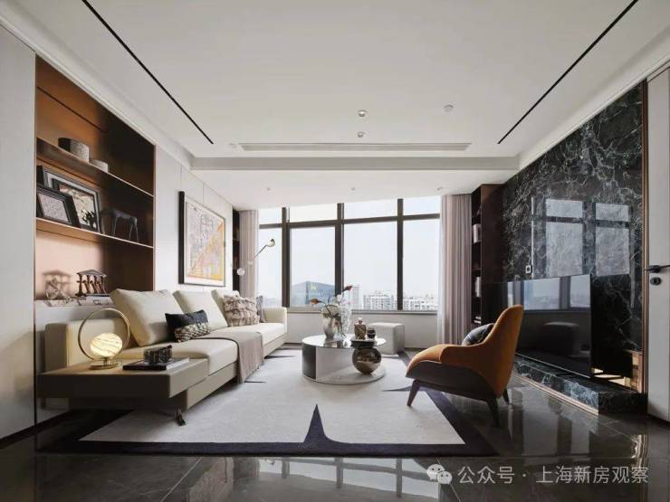客厅270°采光面,配置弧形沙发,窗前可见上海经典三件套;