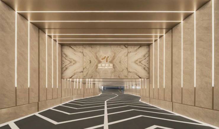 视线再来到车行动线,望宸映澜板块独创的追光地库便映入眼帘,入口两侧及顶部采用铝板、瓷砖搭配竖状灯带,顶部还雕刻了项目logo的超大花纹岩板,随着车辆驶入灯带便同步逐级点亮,每一次归家都成了一场极致的礼序体验。