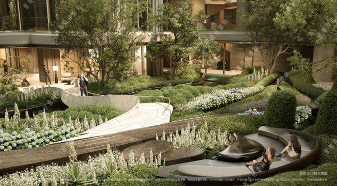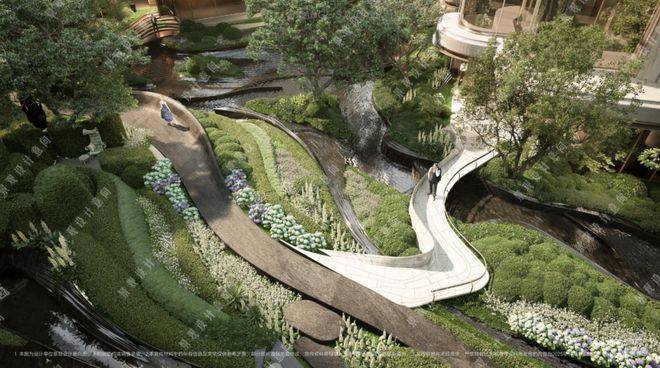 项目拥有罕见立体景观“城市山林”社区,在全域抬板约4米的基础上,项目又下挖,形成罕见垂直落差。依托这一独特地形,项目打造“沿街古树花园+板上浮空花园+板下流石花园”的多层立体景观体系。
