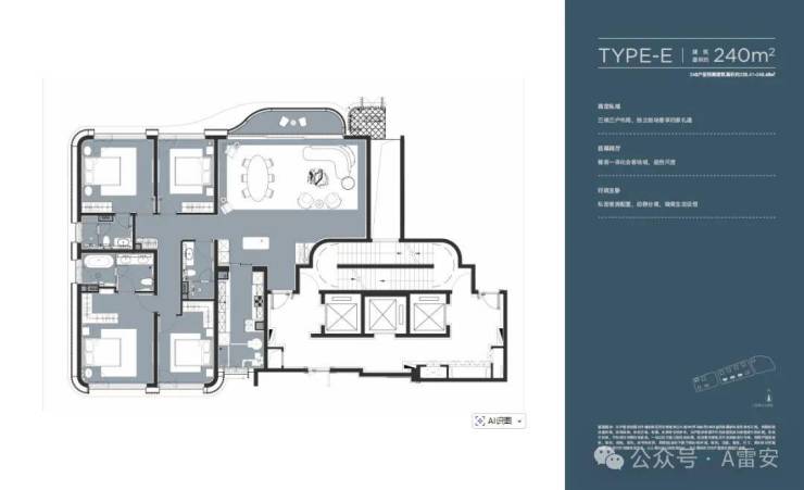 建面约240㎡户型,南北双套房设计兼顾代际需求,让每个家庭成员都能拥有独立静谧的奢居体验。