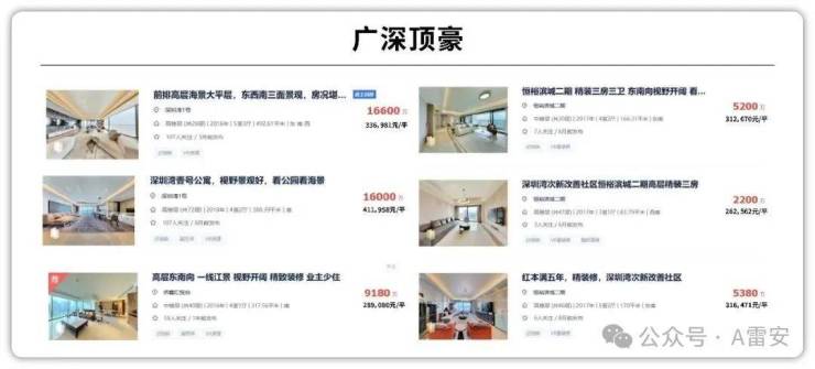 国内其他核心城市顶豪中,深圳湾一号前排无遮挡海景二手普遍30万+/㎡,恒裕滨城二期一线海景30万+/㎡,中信信悦湾顶复38万/㎡,广州侨鑫富悦台28万+/㎡;