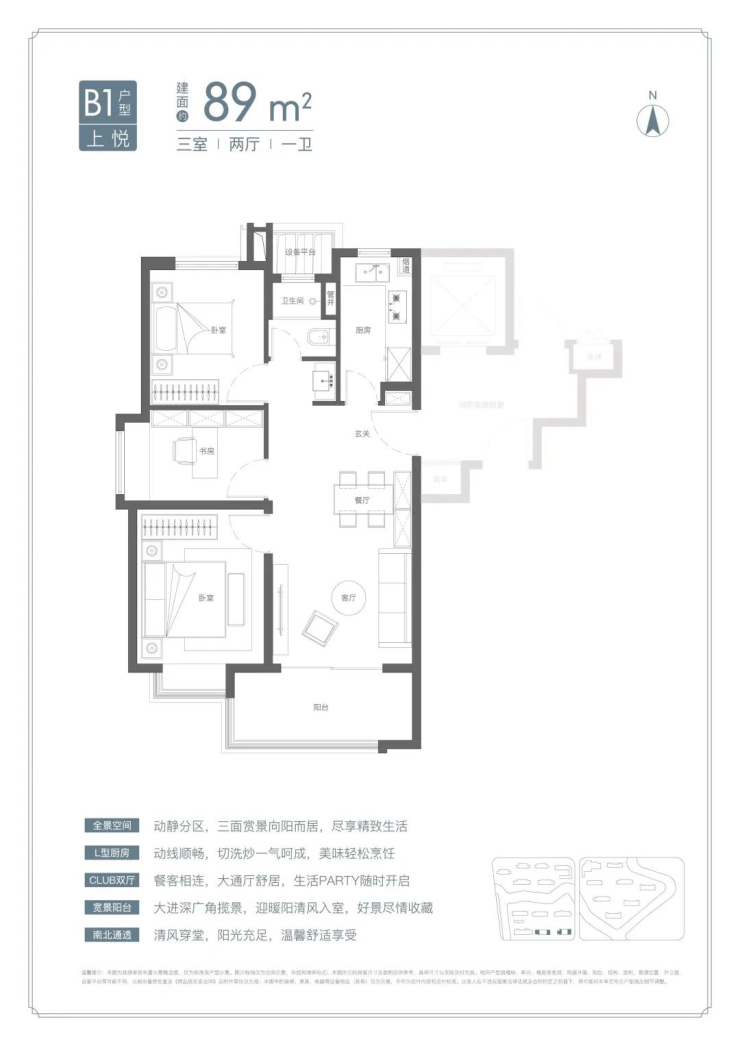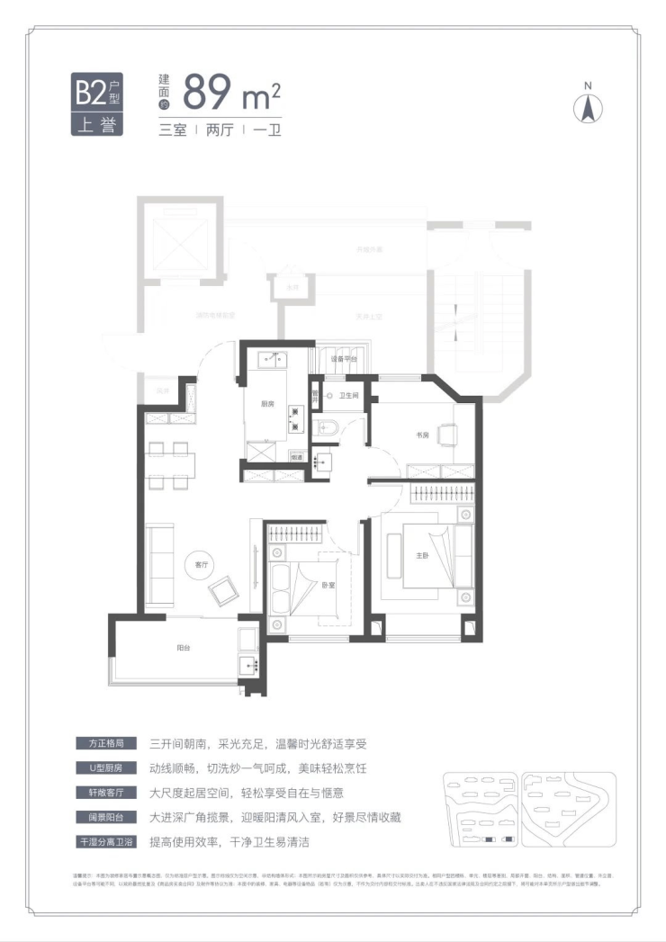 U型厨房、餐厅、客厅、阳台一线联通,南北通透。主卧套房、全卧飘窗、次卫干湿分离也都是标配。