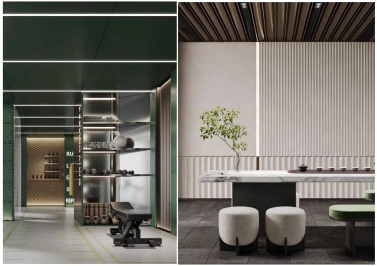 Even in the basement, Hongqiao Jiayuefu adopts a high-standard design, featuring custom bronze-colored stainless steel trim, skirting boards, door frames, and imitation bronze-colored aluminum plates, complemented by large-sized Kata green jade rock plates and mirror-finish stainless steel, highlighting an elegant and artistic taste.