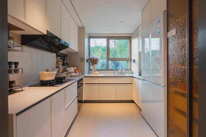厨房收纳:利用烟机管道两侧空间,收纳五谷杂粮;高柜安装天使拉篮等,让厨房实现普通户型约1.5倍的操作台空间(借用飘窗)