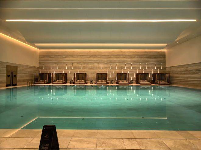 会所内的泳池上方做流畅且立体的吊顶线条,造型现代且富有层次感。