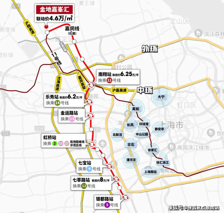 直线距离嘉闵线城北路站(在建)约200米,8站直达大虹桥,连接七宝、莘庄等多个CBD。同时,嘉闵线目前沿线新盘均价在6-8万/㎡,相比之下高层均价约4.5万/㎡的金地嘉峯汇洼地属性明显,未来必然能持续的从虹桥、市区两大中心导入人口,经久不衰!