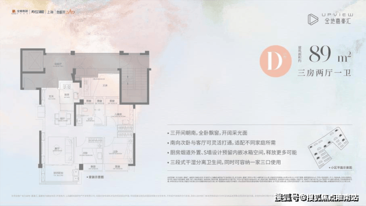 再来看看建面约89㎡三房两厅一卫(D户型),不仅功能完备,而且很好地把控了总价,约350万起即可上车高配品质三房,空间感十足!