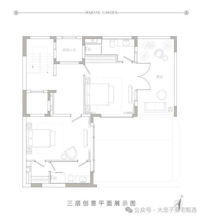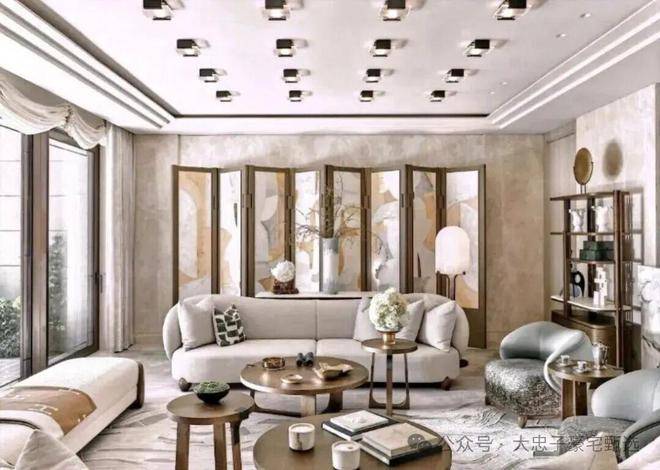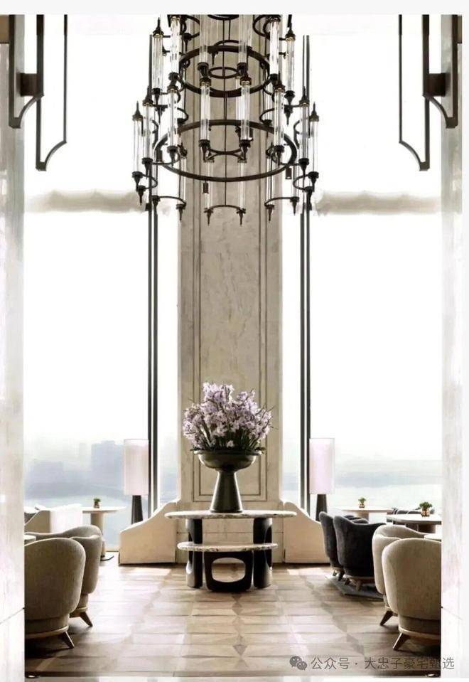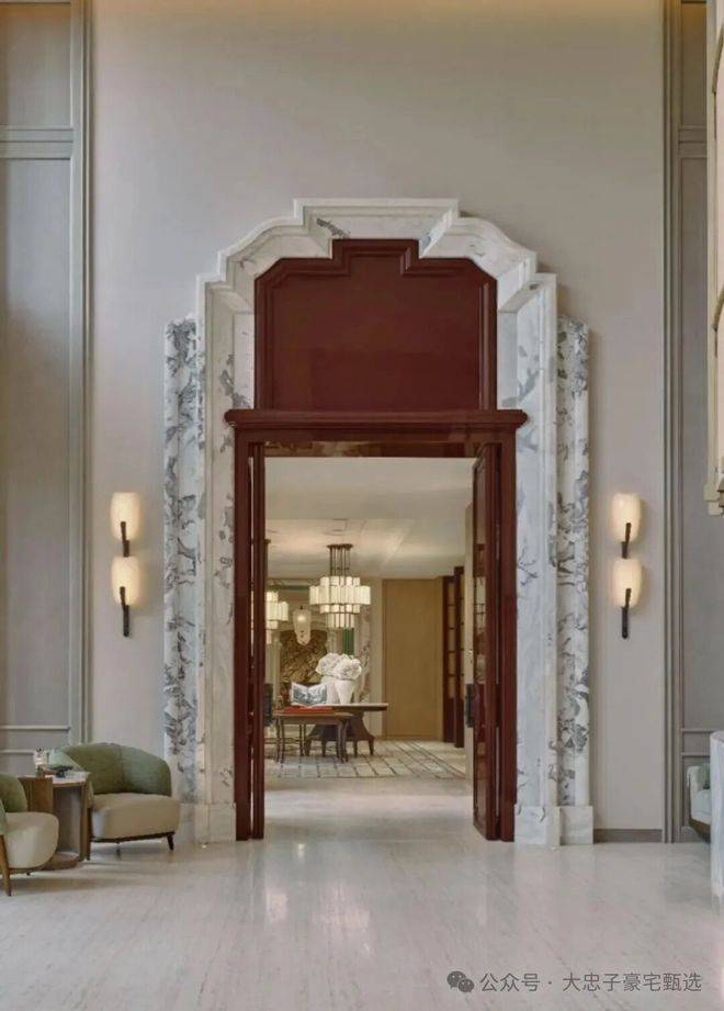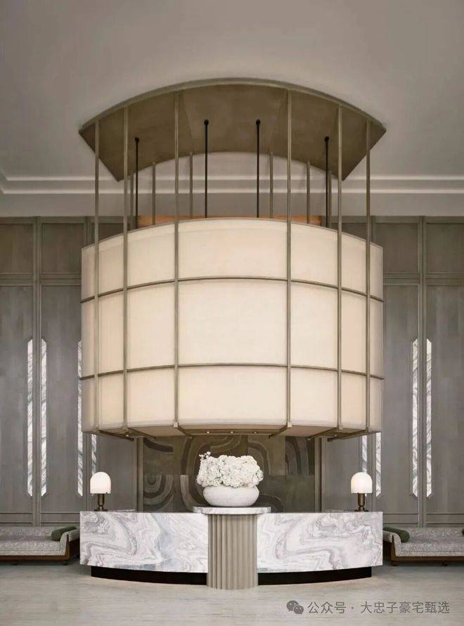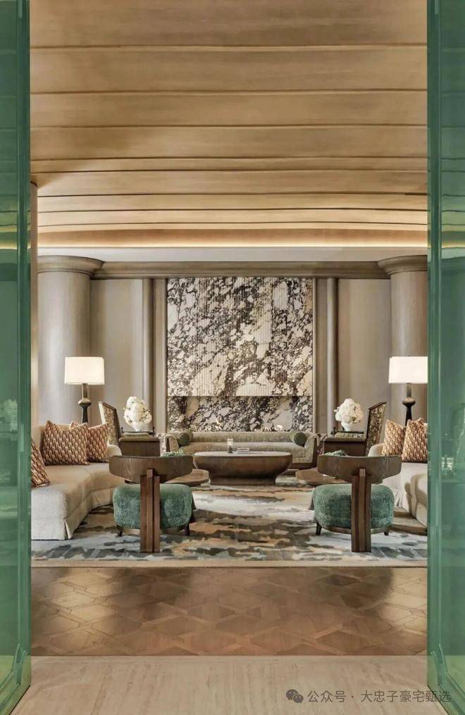 顶层下午茶区以淡绿为底,壁炉暖光漫过手绘地毯的肌理,将社交场域沉淀为冥想容器;主人房墙面缟玛瑙(Onyx)的天然流痕,也与一层屏风暗纹形成时空对位,光影在矿物晶体中生长出私密的诗。