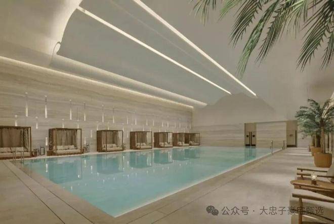 会所内的泳池上方做流畅且立体的吊顶线条,造型现代且富有层次感。这样的设计不仅提升了空间的视觉效果,更营造出一种轻松、悠闲的度假氛围。