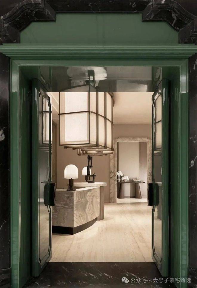 石材两侧,两扇深邃而富有生机的绿色门扇跃然而出。这抹“绿”,绝非随意之选——它呼应东方山水画中的“青绿”,是自然生机的隐喻,亦是空间活力的点睛之笔,与石材的沉稳形成静谧与生机的第一重对话。
