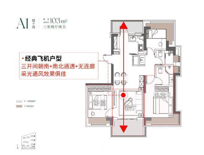 建面103㎡3房2厅2卫,户型三开间朝南、室内“5个飘窗+2阳台”,不管是采光、视野、通风、私密性,还是实用性都十分出色。