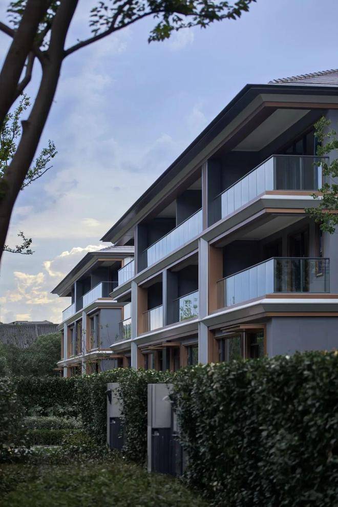 最终整体格局形成北侧洋房、南侧排屋、涵盖街角幼儿园配套的组合,最大化利用土地资源与景观视线,优化交通组织流线,采用坡屋顶的宋式古典形制进行优化,建筑材质以白色和灰色为基调,金属收边呈现整体现代感。让人们身在其中,体验到自然绿意的同时,也能感受现代化宋氏古韵,所见即所得。