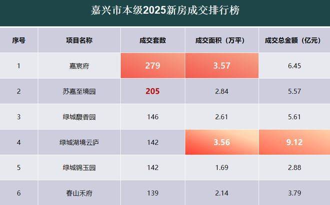 在经过一番调研,并详细询问了市场在售新盘的情况后,我们整理了一份嘉兴楼市2025上半年新盘成交套数+面积+金额三榜TOP6。