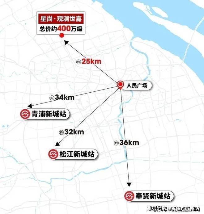 从地图上就可以很直观的看到,项目距离人民广场直线约25km,这个地段比6万均价的松江新城、5万均价的青浦新城和奉贤新城更好。