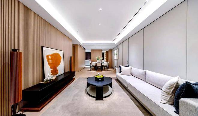 客厅无主灯、隐藏式的空调出风口、木饰面电视机背景墙、内嵌式的金属踢脚线,极简风审美呈现: