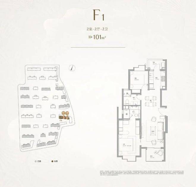 建面约101㎡2房2卫,LDK一体化设计;主卧套房配置步入式衣帽间+独立卫浴;南北双阳台系统,实现270°采光通风。