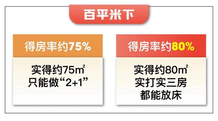 ✔得房率约80 -83% , 相比常规75%,百平米面积多一间书房。当然实用率更高,也变相分摊了房价,实际单价更划算,也让400万级起的价格更具性价比。
