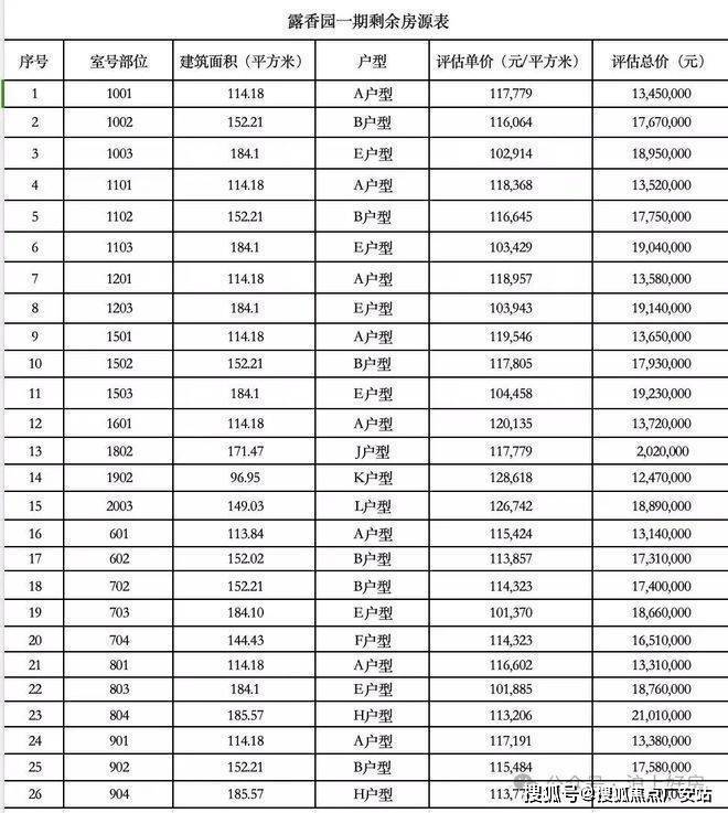 馥公馆一房一价表如下