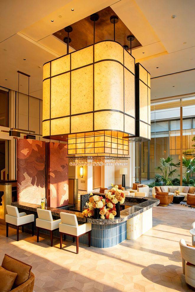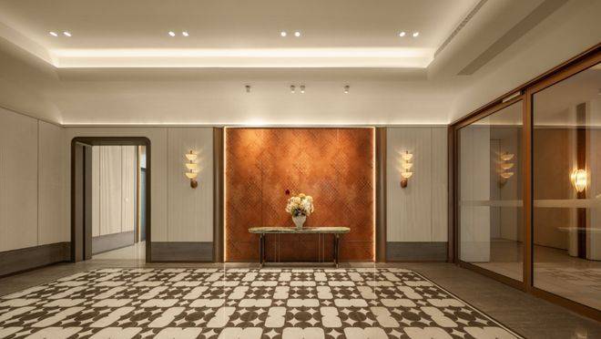 项目配备近6000平方米的室内外一体化会所,涵盖恒温泳池、健身房等高端功能区,并设有童玩、运动、社交、阅读等五大主题架空层泛会所,整体配置堪比千万级豪宅。高达8米的菱形网格顶四季花厅,复刻酒店的通透奢华,扶梯、电梯与艺术楼梯构建交通中枢,将酒店礼仪空间转化为住宅高效动线枢纽,实现美学与实用的完美融合。绮丽大堂以石材拼花与木饰面相得益彰,延续酒店材质碰撞的设计逻辑,中和冷硬感营造归家温暖,兼顾耐用性与舒适度,让仪式感与归属感并存。