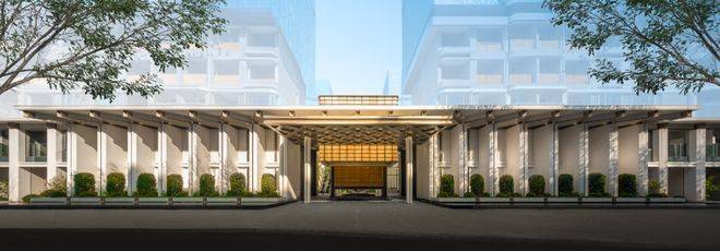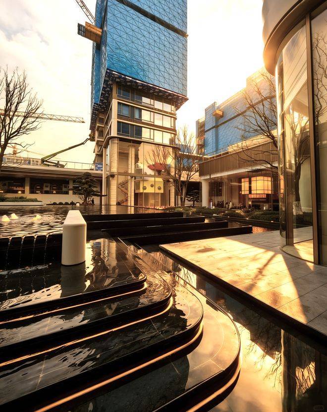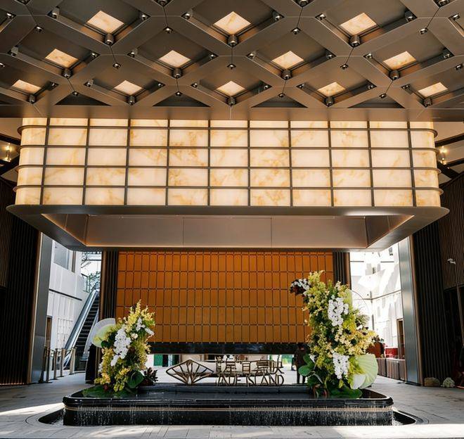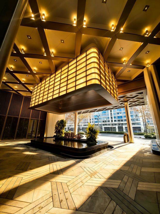 社区主入口以伦敦梅费尔瑰丽酒店为设计原型,打造了气势恢宏的酒店式门仪,200米宽的酒店式门仪,近7米高檐口,16根柱廊排成序列,步入其中宛如穿越高端酒店的入户长廊,气场瞬间拉满;点睛之笔「明瓦灯笼」,近10米宽、6米高的巨型光影装置,金色雨棚与玉石纹理透光材质巧妙衔接,下方是粼粼水景,光影流转间,直接点亮归家的仪式感。