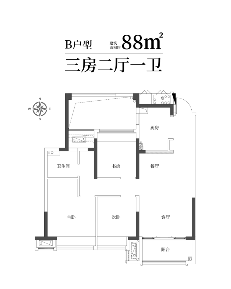 建筑面积约88㎡精雅三房一卫,三口之家理想