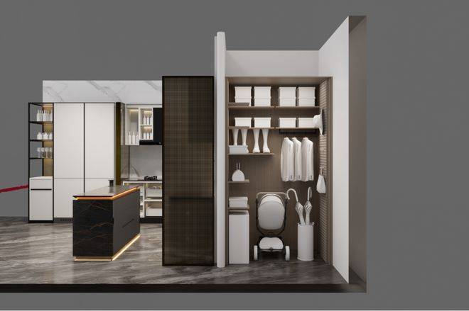 主卧和约99平户型一样,衣柜更大形成衣帽空间,还交付有半开放式、类似于酒店的迷你吧设计: