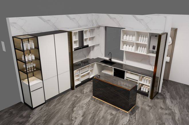 其次,厨房呈科学的U形设计,动线更为合理,无论下厨或是端饭,操作都非常便捷。