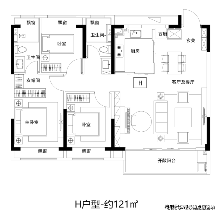 建面约121㎡的4房2厅2卫,是“一步到位”的改善大户型,设计上南北通透,外接超大观景阳台,采光和通风效果佳,关键是尺度阔绰,视野开阔。