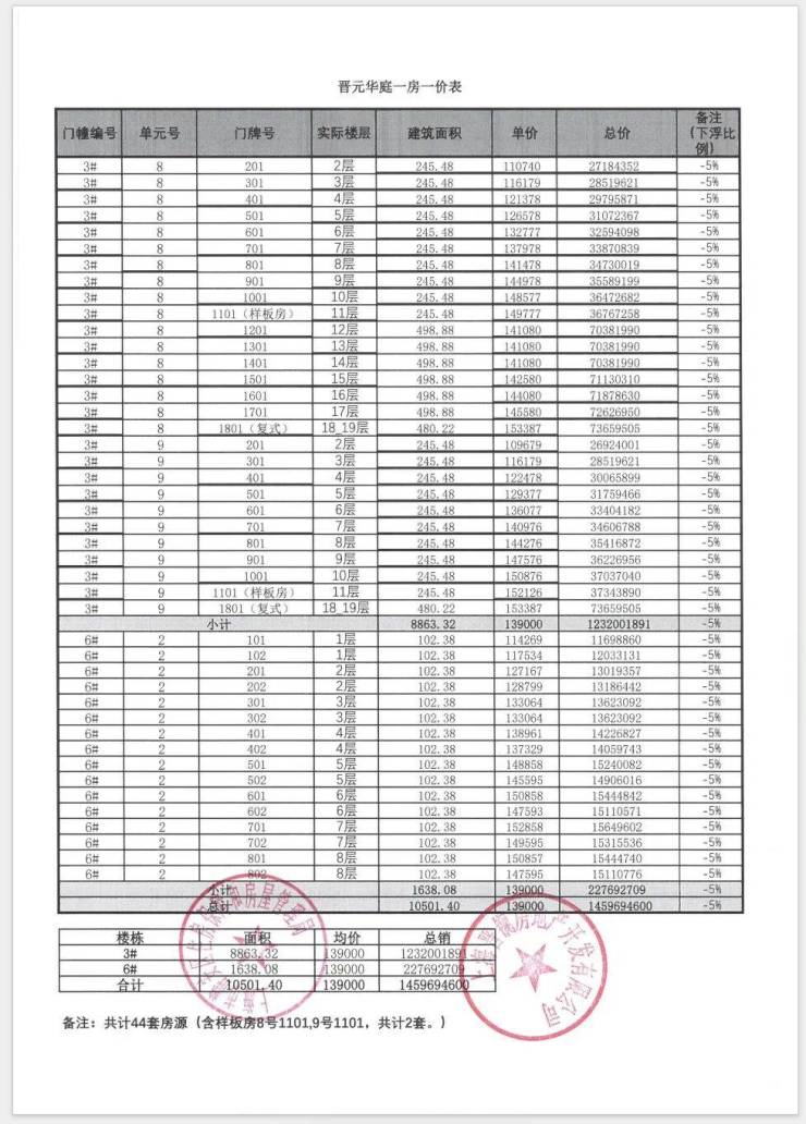 2024年11月30日 推出3号、6号 共计:44套。面积段:102-498平米。销售均价:13.9万/平米。