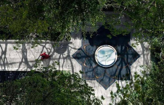 在“润园八景”中,入口迎宾处的“申之华”用“帝王黑”天然奢石等材料,经手工切割打磨拼装勾勒出玉兰花造型,旁立百年广玉兰古树,形成传统与现代的时空对话。