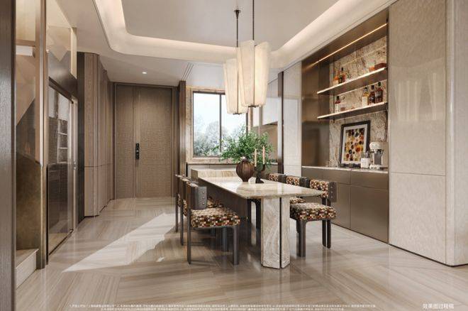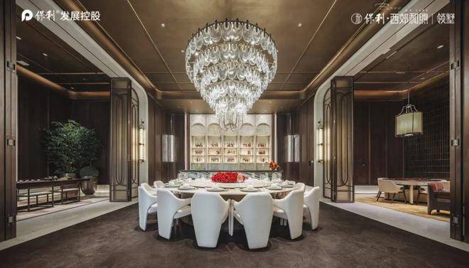 诠释会所奢华感的是拥有艺术水景吊灯、配备智能化系统的私宴厅,吧台由整块瑰丽的香格里拉绿奢石一体打磨,还有一个16座的超大圆形餐桌。