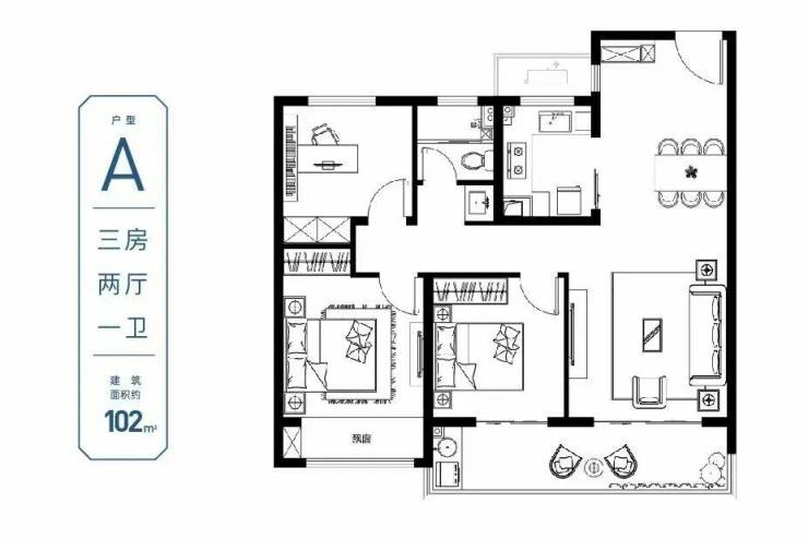 102㎡(三房两厅一卫):户型方正,三开间朝南;U型厨房设计;主卧套房设计,私享步入式衣帽间,阳台开间约6.7米,让客厅更加通透敞亮。