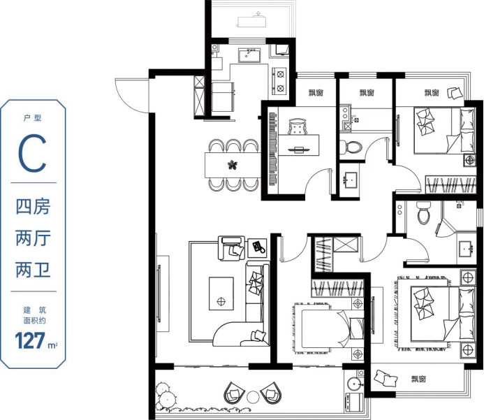 127㎡(四房两厅两卫):餐厅、客厅、厨房、阳台连成一线,形成一处约45㎡集中活动空间;三进式主卧套房;全飘窗设计,打造全明疏阔场地。