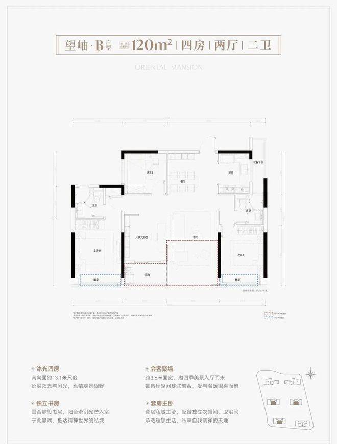 这款改善四居户型,拥有同面积段罕见的约13.1米南向大面宽,四个房间面宽均超过3米,南向主卧和次卧分布在客厅两侧,保证了居者私密性;客餐厅、阳台一线贯通,不仅轩敞气派,而且采光效果更好;主卧套房设计,舒适度拉满。