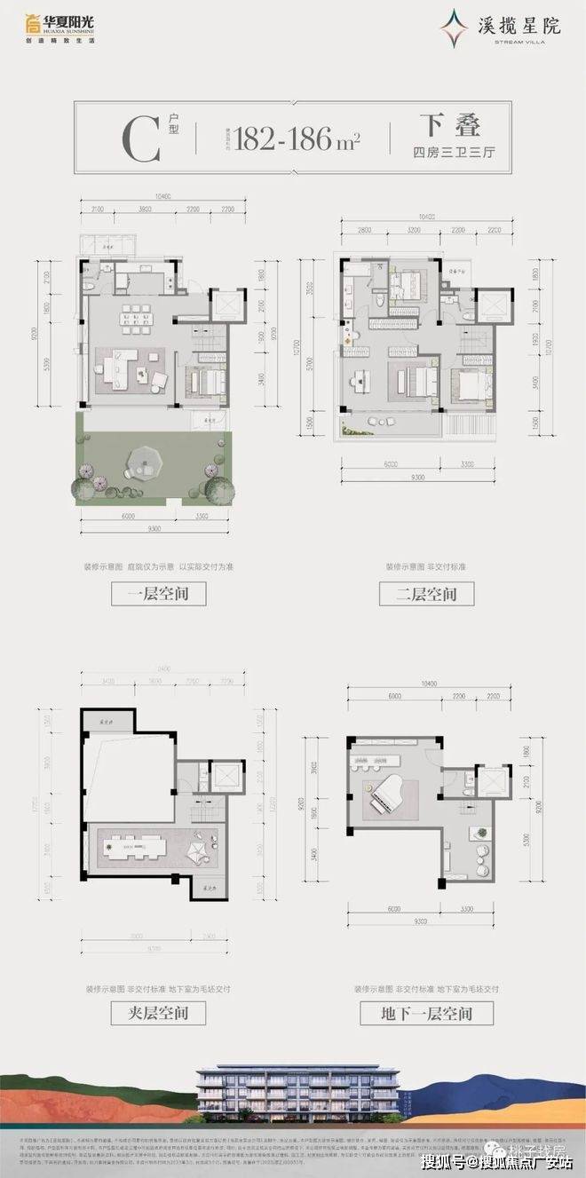 建面约182~186㎡下叠:多功能地下室/约6m瞰景阳台/豪华主卧套房/父母阳光房