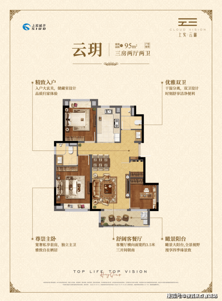 约95㎡三房两厅两卫,做到了三开间朝南+瞰景大阳台+主卧套房设计+南北通透+卫生间干湿分离,该户型得房率和空间利用率都非常高.