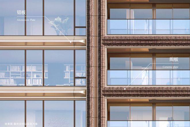 建筑四面均采用铝板+玻璃+定制陶艺,历经百次试烧锻造鎏金陶板,成就上海唯一国际东方艺术全景立面,每面皆城市封面,整体采用非对称的结构设计,回应上海东西方文化交融碰撞的城市美学。大胆采用四排楼布局,以保证户户通风采光,类一梯一户无连廊设计,将入户私密性做到极致。